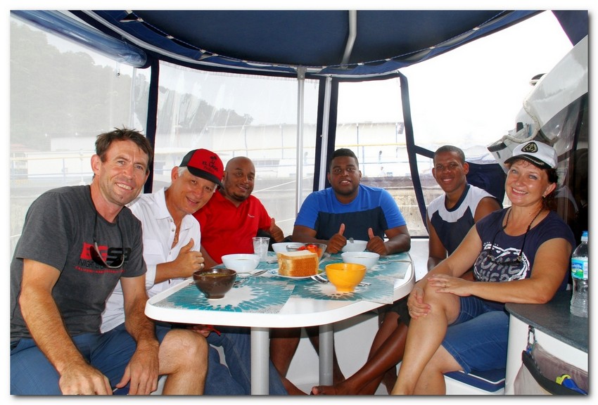 В день выхода получили расписание прохода, согласно которому всё начиналось после обеда. Для самого прохода пришлось нанять еще троих недостающих членов команды, взять в аренду большие канаты, чтобы удерживать и направлять катамаран в шлюзах, и огромные кранцы для защиты от стен канала. Всем этим нас обеспечил агент. За два часа до выхода новые члены команды (Эрик, Алан и Джоэль) прибыли к нам на борт вместе со всей экипировкой.