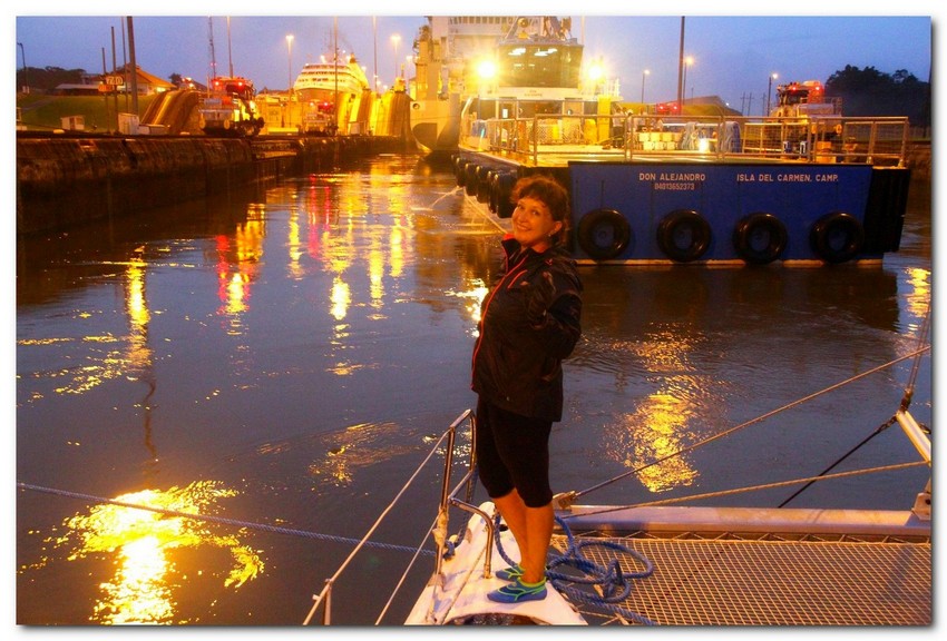 Вышли в озеро Гатун уже в кромешной тьме. Далее двигались, ориентируясь только по маленьким огонькам, ничего не видя перед собой в воде. Отошли в сторону от судоходных путей и пришвартовались к светящемуся бую. Подошел патрульный катер, забрал пилота. Обвязавшись кранцами, чтобы предотвратить трение буя о катамаран, плотно и вкусно поужинали и, уставшие, отправились спать. Вдруг ночью проснулись от грохота неизвестного происхождения! Вскочили, заметались по палубе, выискивая – что же случилось? Оказалось, что леерный трос, перегруженный 5 кранцами, вырвало из стойки. Наскоро привязав кранцы к основаниям стоек и закрепив оторванный трос, снова легли спать.