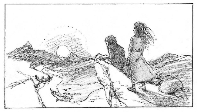Безоблачное небо светлело, и идти становилось проще. По мере того, как Тали и Онисана приближались к своей цели, она всё больше пугала их. Вершина горы была так высока, что её скрывала чёрная масса камней основания. Брат и сестра остановились у подножия.