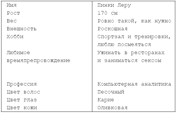– О, знаю! Пиши так, – говорит Ребекка хриплым голосом кабацкого пропойцы. – Вагину или член, высокого или маленького роста, с эпиляцией или без, предпочтительно секси.