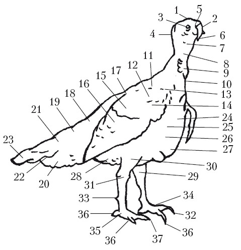 Стати индюка: 1 – голова; 2 – клюв; 3 – глаз; 4 – ухо; 5 – ноздря; 6 – мясной придаток над клювом – «сережка»; 7 – горло; 8 – «подбородок»; 9 – «кораллы» – бородавкообразные наросты; 10 – шея; 11 – воротник; 12 – плечо; 13 – фронт крыла; 14 – плечевые перья; 15 – кроющие перья крыла; 16 – вторичные маховые перья (под ними сложены первичные маховые и их кроющие перья); 17 – спина; 18 – поясница; 19 – малые кроющие перья хвоста; 20 – поясничные перья; 21 – верхние кроющие перья хвоста; 22 – нижние кроющие перья хвоста; 23 – хвостовые перья; 24 – «борода» – местный пучок волос; 25 – фронт груди; 26 – бока груди; 27 – грудная кость; 28 – оперение голени; 29 – кочень; 30 – голень; 31 – пятка; 32 – плюсна; 33 – шпора; 34 – лапы; 35 – подошва; 36 – пальцы; 37 – когти