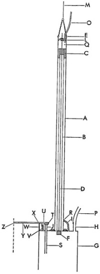 Fig. 5 Diagrammatic cross-section of the Mackereth core-sampler (not to scale). The letters are referred to in the text. (Limnol. Oceanogr. 1958)