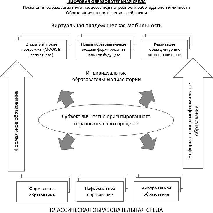 Известно, что цифровая трансформация формального образования сопровождается расширением спектра дистанционных образовательных технологий, технологий смешанного и электронного обучения. В цифровой образовательной среде возможна реализация гибких, модульных образовательных программ, которые позволяют выстраивать индивидуальные образовательные траектории. Удаленный доступ к образовательным услугам приводит к росту виртуальной академической мобильности. Массовые онлайн-курсы на платформах открытого образования отвечают на запросы профессиональной подготовки кадров цифровой экономики. Открытые образовательные ресурсы Российской электронной школы, Московской электронной школы, различных образовательных платформ (цифоровая образовательная платформа, предложенная Сбербанком и др.) открывают новые перспективы развития общеобразовательной школы.