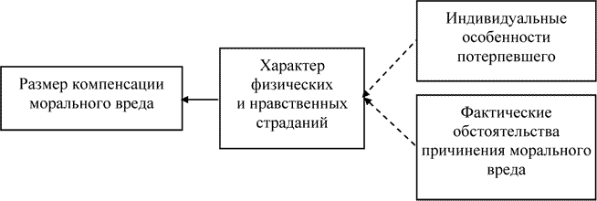 Пунктирная стрелка на схеме означает, что возможна ситуация, когда в отсутствие юридически значимых индивидуальных особенностей потерпевшего и фактических обстоятельств причинения морального вреда единственным критерием оценки степени физических и нравственных страданий потерпевшего будет только их характер.