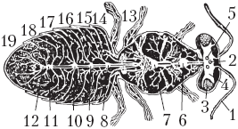 Нервная система рабочей пчелы (вид сверху): 1 – усик и его нервы; 2 – простой глаз; 3 – сложный глаз; 4 – зрительная полость; 5 – головной мозг; 6–12 – узлы брюшной нервной цепочки; 13–19 – брюшные сегменты