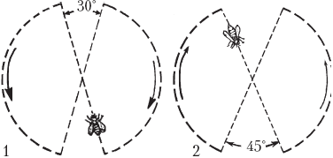 Схема «виляющих танцев»: 1 – полет к месту добычи «от солнца» под углом 30°; 2 – полет к месту добычи «к солнцу» под углом 45°