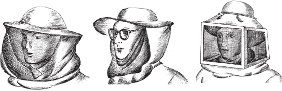 • Сетка для защиты лица от ужаленья пчел. Лицевая сетка имеет вид шляпы, сшитой из ситца, с передней стороной – из черного тюля. Нижняя часть сетки плотно стягивается вокруг шеи резинкой или шнурком.