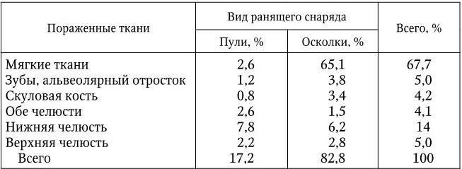 Частота и структура челюстно-лицевых ранений в период локальных современных конфликтов представлена в таблице 2.