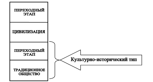Таким образом, необходимо отметить, что на первых двух этапах происходят сложные процессы, либо стимулирующие общество для дальнейшего развития, либо являющиеся причиной его стагнации, а в дальнейшем, возможно, и гибели. Эти два этапа можно объединить под названием «культурно-исторический тип». Необходимо уточнить, что термин «культурно-исторический тип» введен Н. Я. Данилевским в работе «Россия и Европа» и используется для характеристики этапа развития общества, предшествующего цивилизации.