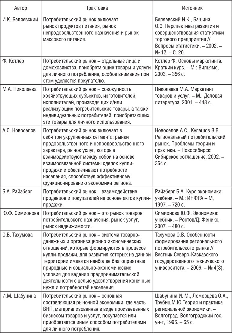 Таблица 1.1. Различные трактовки понятия «потребительский рынок»