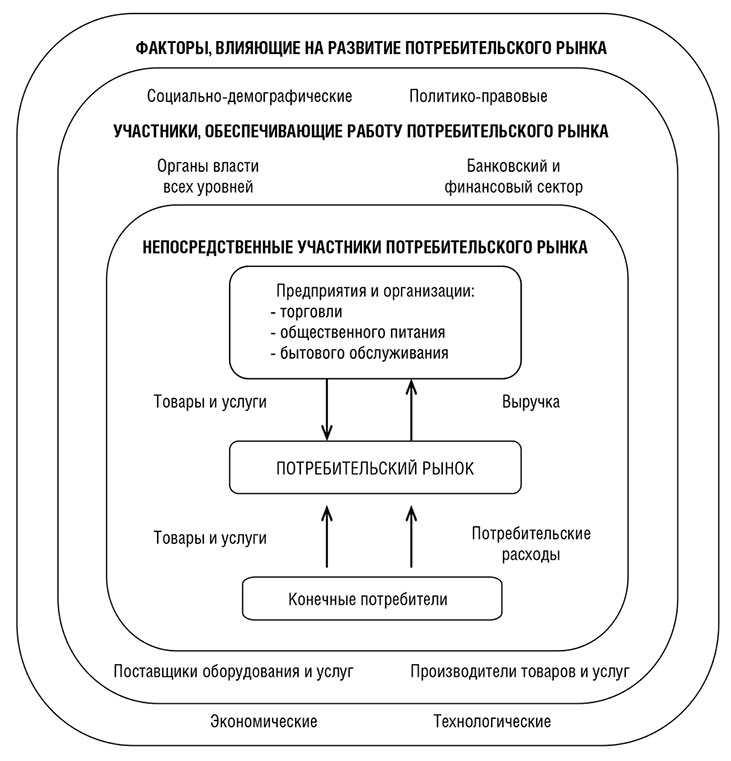 Непосредственными участниками потребительского рынка являются предприятия и организации торговли, общественного питания, бытовых услуг и конечные потребители, между которыми складываются товарно-денежные отношения.