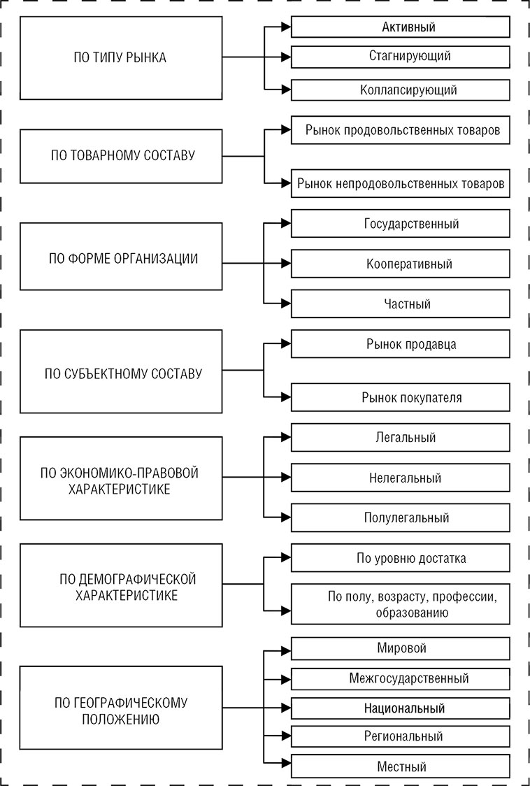 5. Экономико-правовая характеристика включает организацию деятельности на легальных рынках (т. е. функционирующих в соответствии с нормами законодательства), полулегальных и нелегальных, действующих с частичным или полным нарушением законодательства, заключающимся в обращении неучтенных товаров, незарегистрированных торговых фирм.