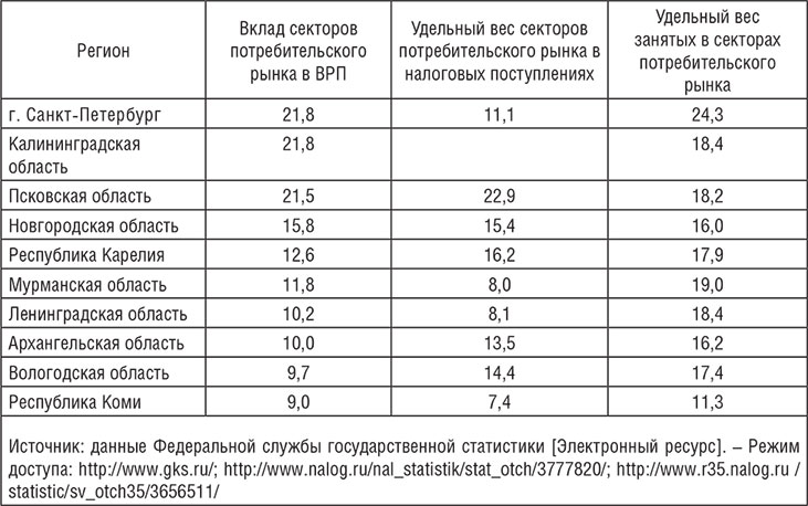 В 2009 г. наибольший вклад секторов потребительского рынка[3] в ВРП, а также в налоговые поступления был в Псковской и Калининградской областях (более 20 %), а наибольший удельный вес занятых в этих секторах – в Мурманской области (19 %). Вологодская область, опережающая по вкладу секторов потребительского рынка в ВРП (9 %) только Республику Коми, занимает 5 место (14,4 %) по налоговым поступлениям в бюджет, а удельный вес занятых в данных секторах области находится на уровне средних значений по округу (17 %; табл. 1.2).