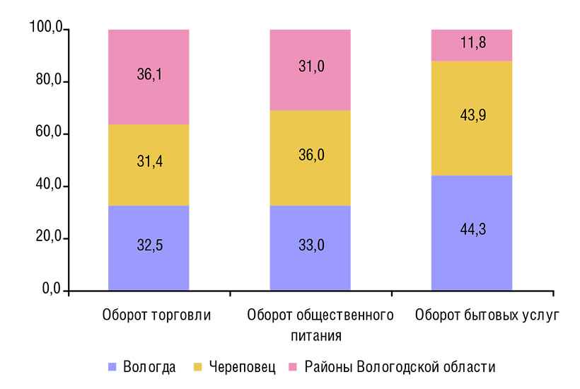 Потребительский рынок в большей степени развит в крупных городах, являющихся региональными центрами, что объясняется концентрацией в них товаропотоков и высоким спросом на товары и услуги. Это подтверждает ситуация, сложившаяся в Вологодской области, где сконцентрировано около 33 % оборота розничной торговли и общественного питания и 44 % оборота бытовых услуг (рис. 1.4).
