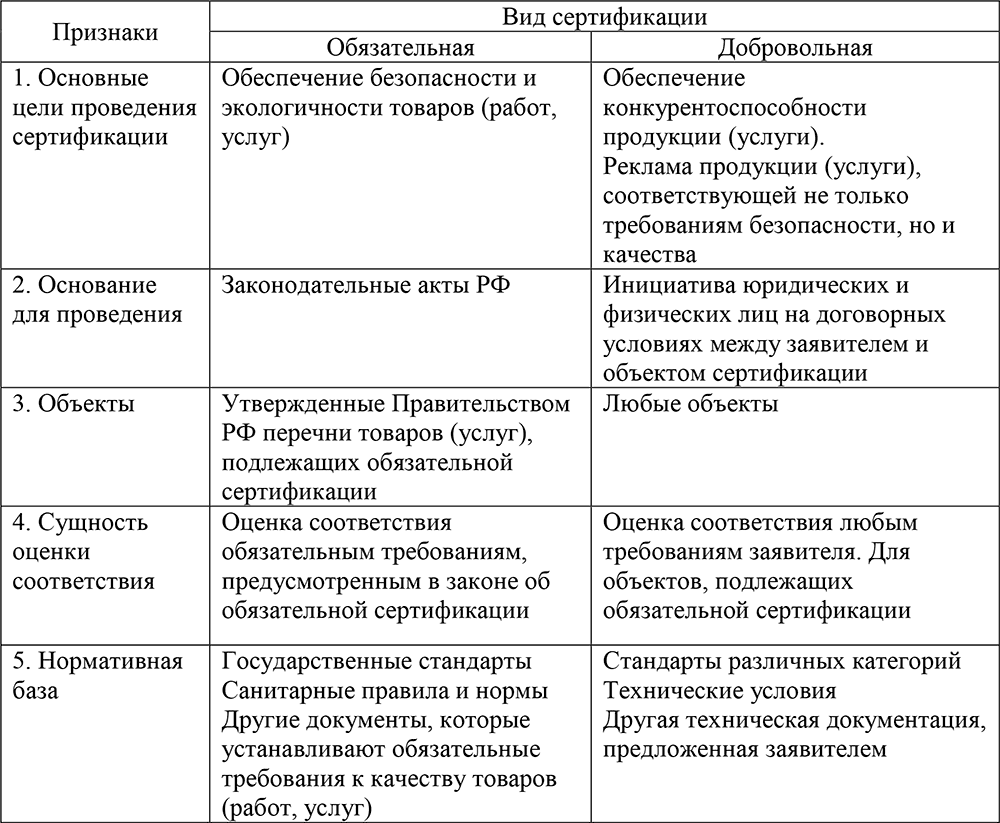Таблица 1. Отличительные признаки обязательной и добровольной сертификации
