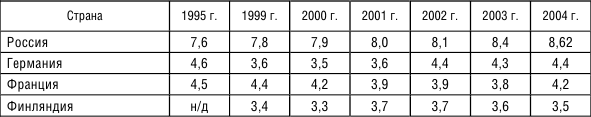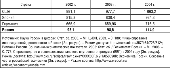 И реальных сдвигов невозможно ожидать, так как не сокращается разрыв в затратах на исследования и разработки между Россией и ведущими промышленно развитыми странами, который за 2003–2004 гг. составлял от 5 до 9 раз (табл. 1.2.6).