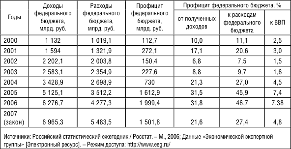 «Прогнозы относительно сугубо негативного влияния разработанного федерального бюджета-2007 на социально-экономическое развитие страны исходят в первую очередь из его доходно-расходных параметров: доходы запланированы в объеме 6,965 трлн. руб., или 22,3 % ВВП, расходы – 5,464 трлн., или 17,5 %, а 1,502 трлн. профицита, т. е. 4,8 % ВВП, будут выведены из народного хозяйства и «заморожены» в Стабилизационном фонде РФ, что, разумеется, обусловит сжатие конечного спроса, а значит, затормозит прирост валового внутреннего продукта.»[15]
