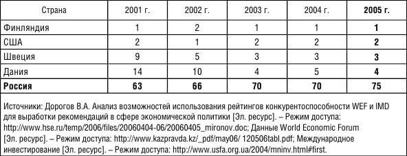 Если же посмотреть на достижения за последние пять лет нашей экономики в рейтинге конкурентоспособности (табл. 1.2.5), то мы увидим, что прогресса нет, есть регресс (смещение с 63 места в 2001 году на 75 место в 2005 году).