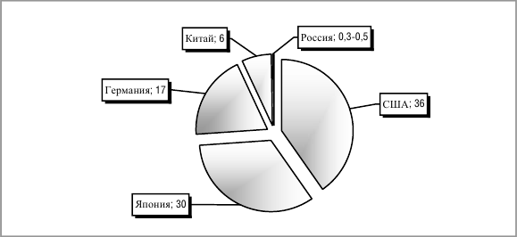 Доля российской наукоемкой гражданской продукции в объеме мировой торговли в 2003 году составляла 0,3–0,5 %, а Китая – 6 %, Германии – 17 % (рис. 1.2.4).