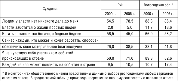 Приведенные в рисунках 1.2.1–1.2.3 показатели базируются на данных Аналитического центра Ю. Левады [Электронный ресурс]. – Режим доступа: http://www.levada.ru; www.wciom.ru и материалах опросов населения Вологодской области, проводимых ВНКЦ ЦЭМИ РАН.