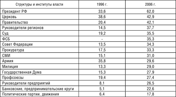 Таблица 1.2.10. Доля населения, доверяющего действующим в стране общественным структурам и институтам власти (Вологодская область; в % от числа опрошенных)