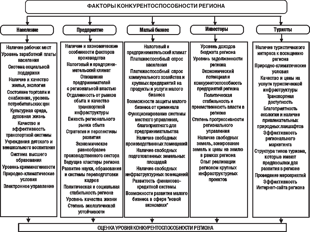 Чтобы обеспечить конкурентоспособность, важно знать, какие факторы способствуют ее повышению. Именно они могут стать основой для проведения оценки конкурентоспособности и формирования конкурентных преимуществ региона[13]. Указанные группы факторов, несомненно, могут быть использованы и для оценки конкурентоспособности региональных экономических систем (рис. 1.3).