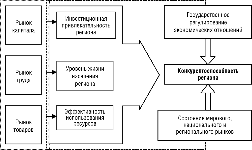 По мнению российских регионалистов Л. И. Ушвицкого и В. Н. Парахиной, под конкурентоспособностью региона следует понимать его способность обеспечить высокий уровень жизни населения и дохода собственников капитала, а также эффективно использовать имеющийся в регионе экономический потенциал при производстве товаров и услуг. Предлагаемая ими концепция оценки конкурентоспособности региона представлена на рисунке 1.4.