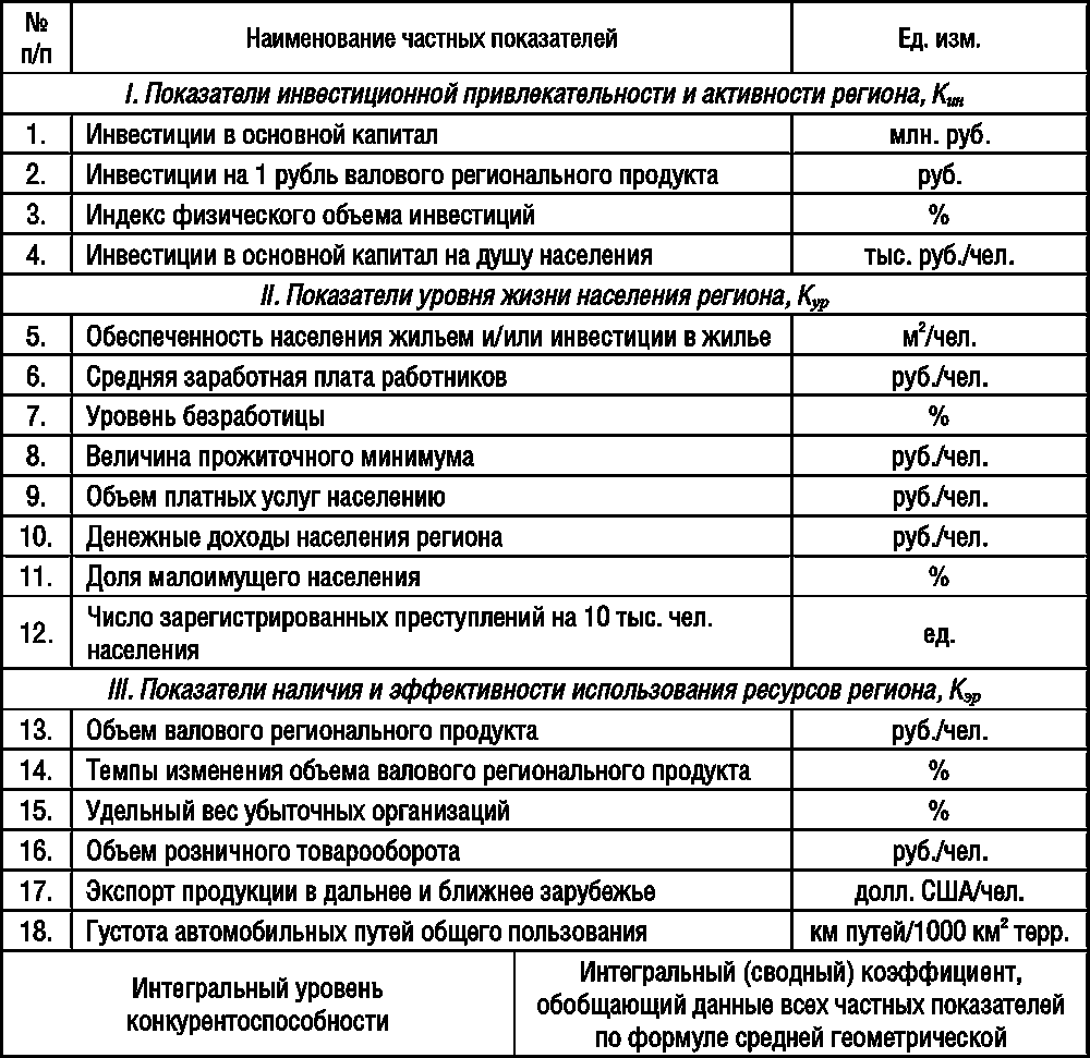 Интегральный уровень конкурентоспособности региона является относительным показателем (коэффициентом), а следовательно, он не должен зависеть от размеров территории или численности населения региона. Поэтому все частные признаки конкурентоспособности включаются в расчет интегральных (сводных) значений с единицами измерения, выраженными относительными величинами – душевыми, темповыми, долевыми, – а в некоторых случаях, в виде исключения, балльными оценками. В отличие от объемных показателей темповой индикатор мало подвержен межрегиональным различиям в специализации экономики регионов.