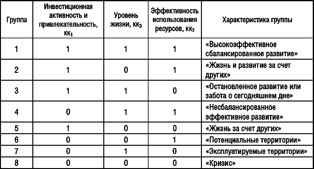 Еще более интересную интерпретацию могут получить данные о показателях конкурентоспособности при сведении в единую систему всех трех параметров, разделяя их по уровню оценки – низкая (0) или высокая (1) – в отношении среднего по сравниваемым регионам значения. Эту систему оценки положения региона можно представить в виде таблицы 1.4.