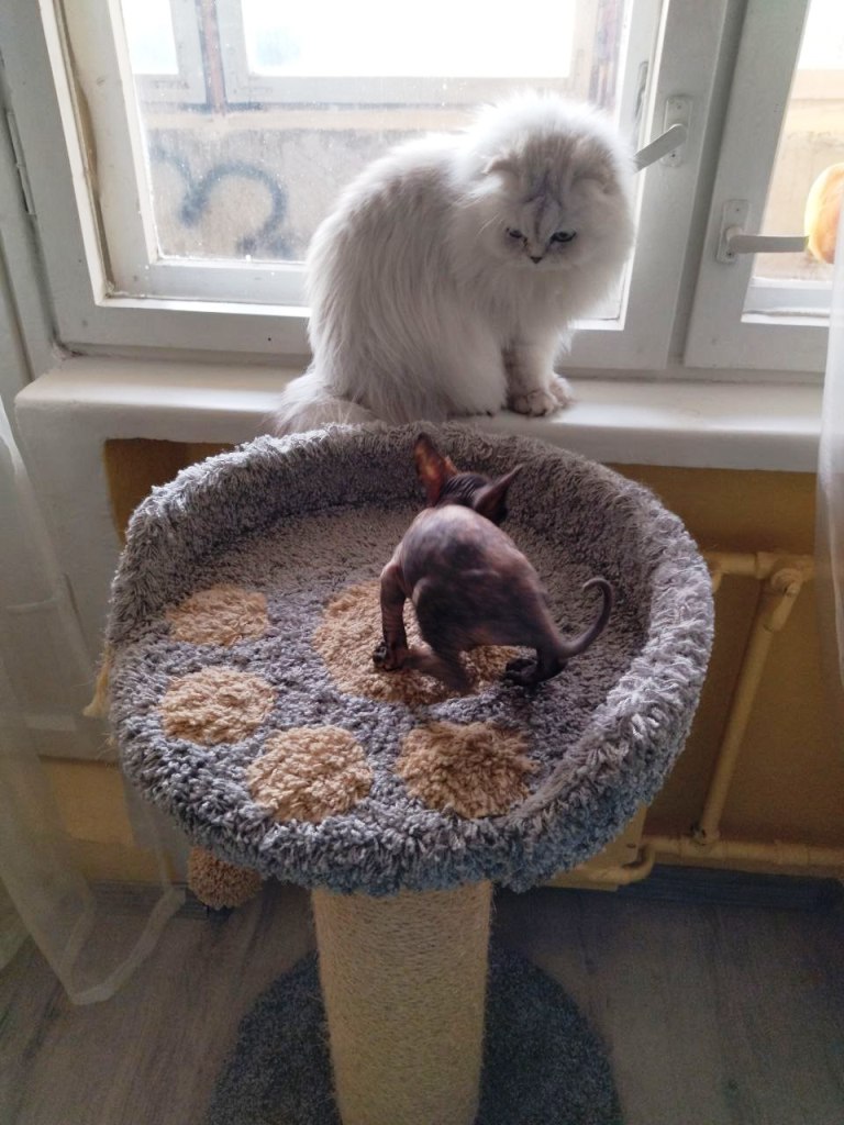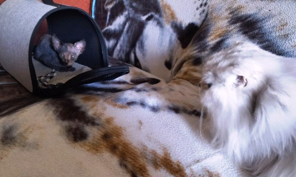 Новенькая привыкает, старшенькая рычит и шипит. Мирка возмущена и рассержена, и всем видом это показывает. Мавка любопытничает и не понимает, почему на неё шипят.