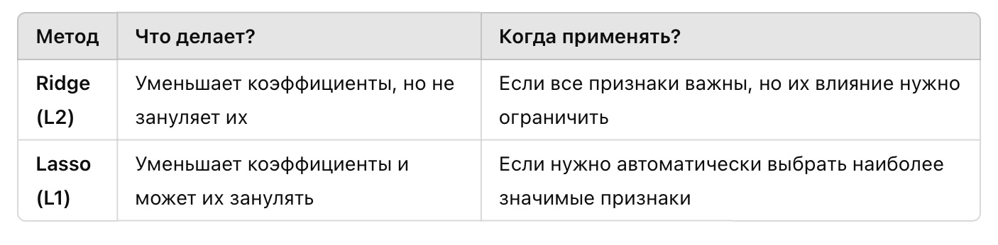 3. Lasso (L1) может занулять некоторые коэффициенты, позволяя автоматически исключать ненужные признаки.