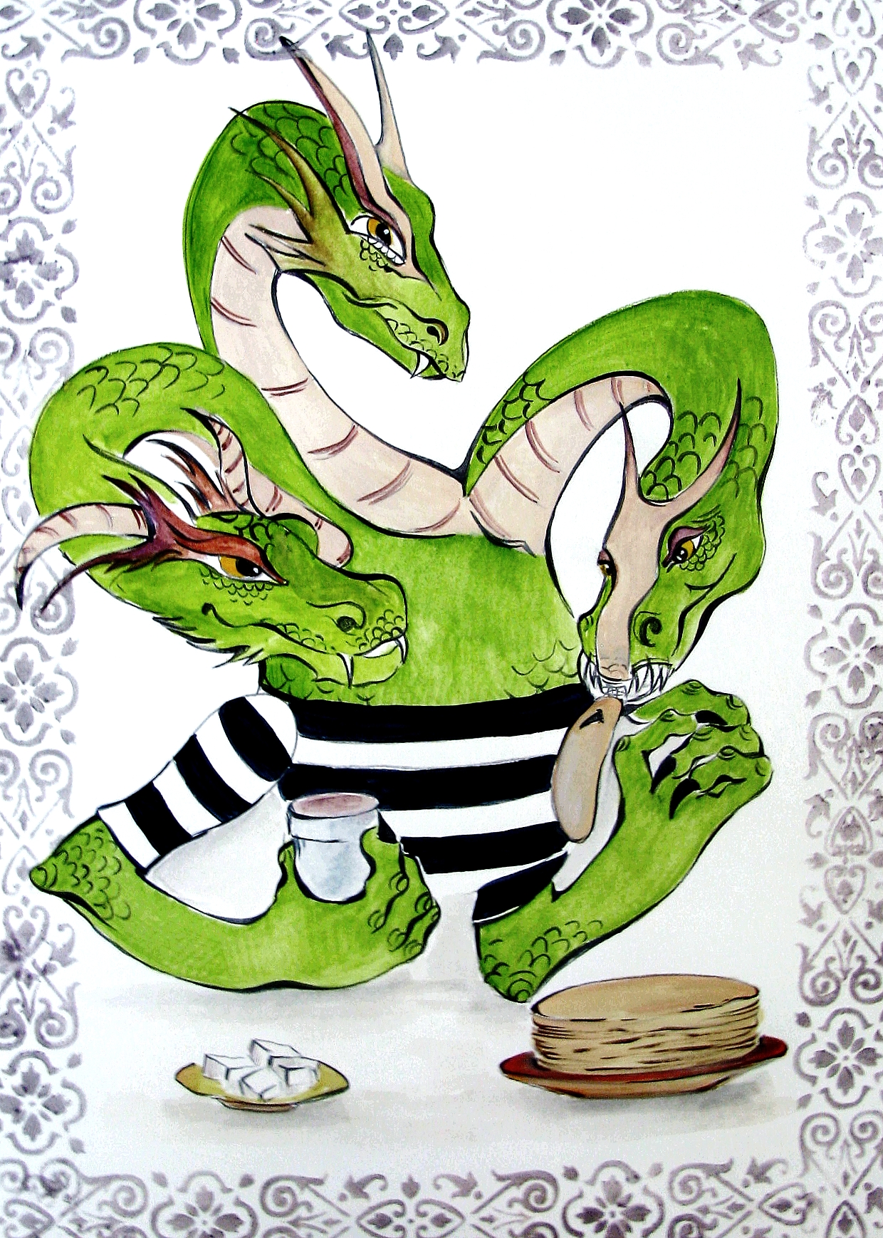 Утром я решила приготовить завтрак. Много мудрить не стала. Просто испекла ажурные блинчики. Змей, услышав, что готовила я сама, приближался к столу бочком. Аккуратно сел на табуреточку и так же аккуратно подцепил двумя когтями блинчик. Обнюхал и осмотрел его со всех сторон. Потом средняя голова решилась и откусила чуток. При этом левая внимательно смотрела на меня, а правая на то, как жует средняя. Я умилилась такому недоверию. Не боись, Змей, вначале травить не буду!