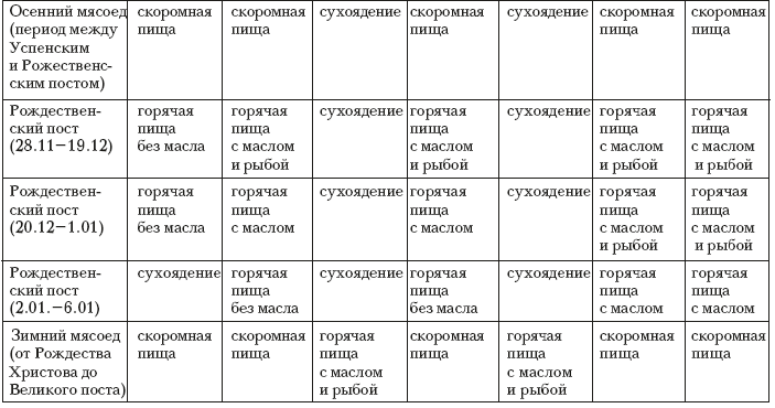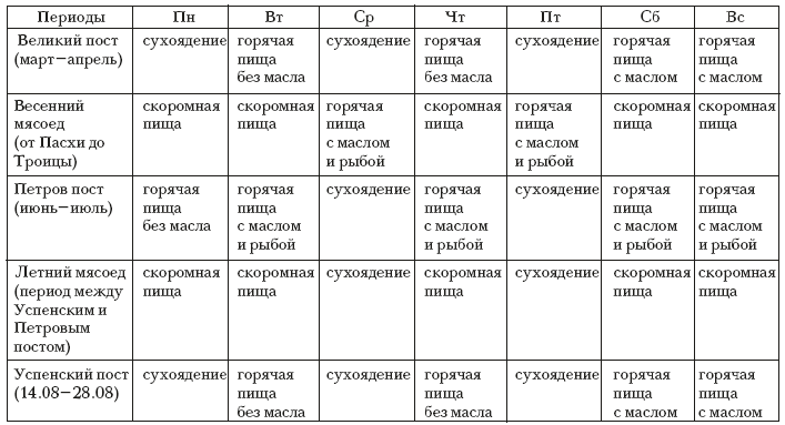 Монастырский устав, которому на Руси довольно часто следуют миряне, в некоторые дни предписывает есть только сырую пищу (фрукты, овощи), а несколько дней в году провести на хлебе и воде или вовсе ничего не есть.