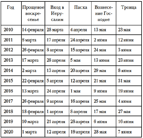 Календарь празднования Пасхи и переходящих праздников на 2010–2020 годы