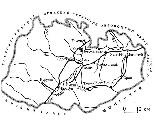 Акша (в прошлом это был старинный город, управляемый атаманом) расположена в живописной местности, украшением которой является река Онон, горы Крестовка, Утёс и Кургатайский хребет. Кругом разнообразный лес (сосна, лиственница, берёза, осина, тополь) и множество кустарников.