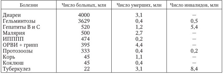 Согласно данным В. П. Сергиева (2007), в структуре причин заболеваемости, смертности и инвалидизации населения планеты важная роль принадлежит гельминтозам и протозоозам (табл. 2).