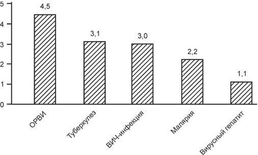 Рис. 3. Абсолютное число умерших в мире от ведущих инфекций в 2001 г. (млн человек)