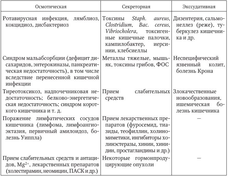 По ведущему патогенетическому механизму принято рассматривать секреторную, осмотическую и экссудативную диарею (табл. 8).