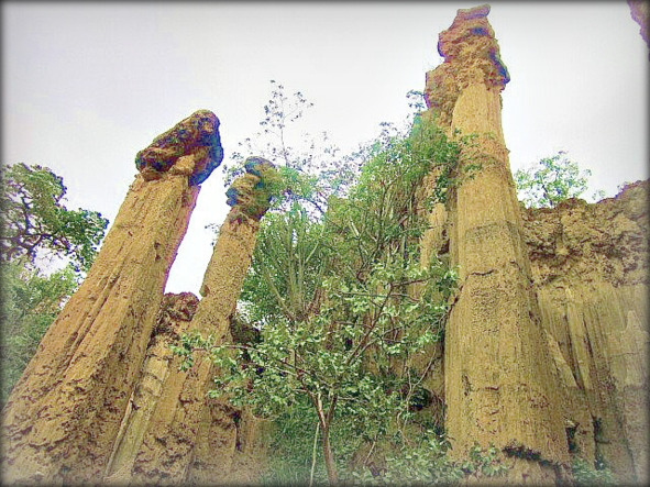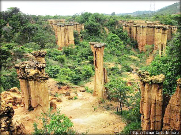 Шли очень долго, обходя влажные колонны в глиняных подтёках, заходя в ниши и забираясь в гроты. Было сыро и скользко, но необыкновенно, до самозабвения интересно. Многочисленные стелы здесь увенчаны каменными глыбами, которые грозили сорваться в любую минуту. Совершенно потрясающее место усиливало своё магическое действие полной тишиной, редкая птица где-то в кустарнике кричала. Сюда спускаться надо группой как мы, а одному или вдвоём жутковато будет.