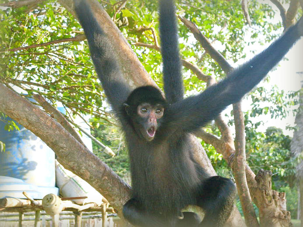 К нашей лодке мы возвращались мимо импровизированного футбольного поля, где мальчишки гоняли мяч. Рядом, на ветвистом дереве, висела огромная чёрная обезьяна-паук. Её необычно длинные руки, ноги и хвост, как толстые канаты держали обезьяну на весу меж ветвей. Она передвигалась с ветки на ветку, вовремя перехватывая всеми пятью «канатами» сучья в кроне. Ей не нравилось сидеть на дереве, как всем нормальным приматам, ей нравилось с него свисать.