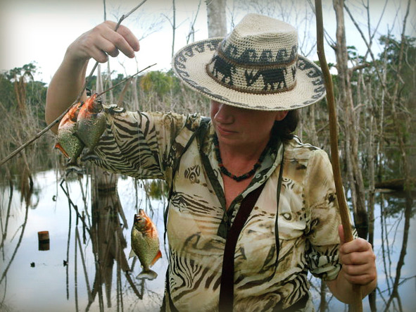 Стоя на берегу агуахаля, всем нам пришлось шлёпать удилищами по воде, создавая её движение, как от вошедшего в воду животного, чтобы пираньи инстинктивно собрались к обеду. А после этого началась настоящая рыбалка.