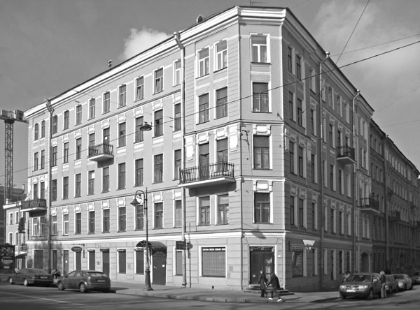 В середине XVIII в. на этом угловом участке, которым владел некто Легинов, по данным Н.И. Цылова, имелось довольно обширное деревянное строение, ко времени оценки домовладения в 1876 г. совершенно обветшавшее, почему в оценку была включена только стоимость земли (3270 рублей). По купчей от 14 июля 1878 г. участок приобрел крестьянин Костромской губернии Еким Семенович Бабков, ставший петербургским купцом. В 1879–1880 гг. гражданский инженер К.К. Тарасов построил здесь пятиэтажный доходный дом с торговыми помещениями. В 1888 г. домовладение стоимостью в 76 523 руб. приобрела жена маловишерского мещанина Анна Александровна Григорьева. При этом стоимость участка площадью в 133,3 кв. сажени составила 9108 руб. В 1894 г. по купчей от 19 декабря домовладение приобрела жена действительного статского советника Анна Александровна Львова.