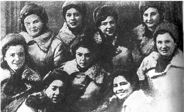 Группа девушек-бойцов разведывательно-диверсионной части 9903 перед вылетом в тыл врага. В центре: Герой Советского Союза Елена (Леля) Колесова, 1942 г.