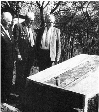 Журналист Ю. Соколов (справа) с бывшими военнопленными у колодца, в который во время войны гитлеровцы сбрасывали раненых красноармейцев.