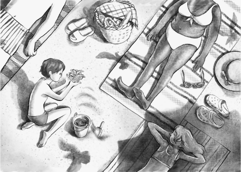 Олежка нырял, плавал до скалы, которая торчала посреди бухты, ловил медуз, отдирал мидий с камней… Когда мама вытаскивала его из воды, чтобы погреться, он садился поближе к прибою и смотрел на чаек, которые носились в небе, и на волны, и на других отдыхающих. Народу здесь было немного, но всё равно интересно наблюдать за всеми и придумывать, кто откуда приехал, как кого зовут, кто местный, а кто турист.