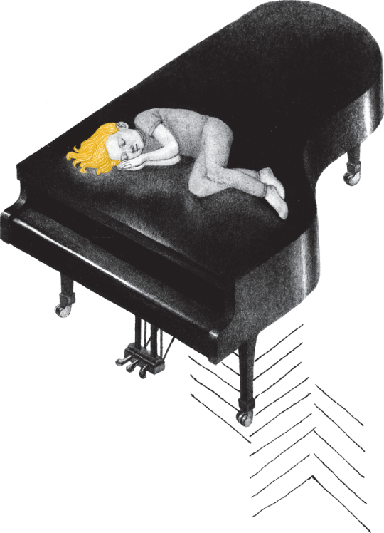 Уставшая, полусонная Алька взбирается на рояль за кулисами, поднимает и комкает подушкой нижний край занавеса, сворачивается калачиком и медленно засыпает под голоса на сцене и мамины хлопки.