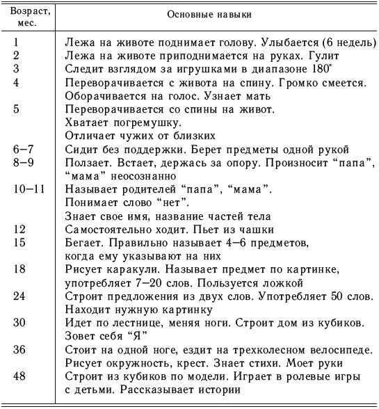 При оценке нервно-психического развития ребенка используют неврологическое исследование (оценку рефлекторных ответов ребенка) и поведенческие реакции. Ребенок рождается с рядом безусловных рефлексов: хоботковый, поисковый, сосательный, рефлекс Бабкина, Моро, Бабинского и др. (см. гл. «Новорожденные»). Многие рефлексы, такие как Кернига, Бауэра, опоры и другие, исчезают к 3–4 месяцам. На 2–3-й неделе жизни ребенок фиксирует взор на ярком предмете, следит за высоко поднятой игрушкой. К 1–1,5-месячному возрасту он начинает держать голову, развиваются координированные движения рук (приближает руки к глазам, носу, разглядывает их). С трех месяцев ребенок ощупывает руки, перебирает руками одеяло, пеленки. С пяти месяцев хватает предметы, но при этом делает много лишних движений, и только к 7–8 месяцам появляется координация двигательного и зрительного анализаторов.