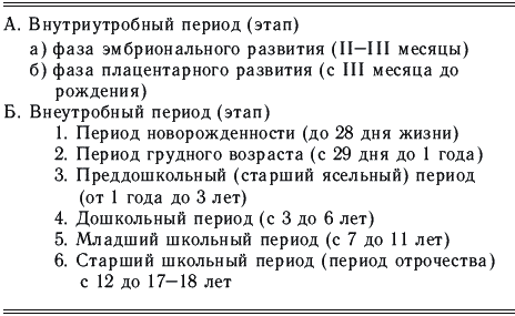Наиболее распространенной классификацией периодов онтогенетического развития человека является модифицированная классификация Н. П. Гундобина, основанная на гистоморфологических и функциональных особенностях организма ребенка (табл. 2).
