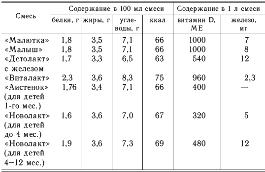 Смеси готовятся на основе цельного коровьего молока («Малютка», «Малыш») или обезжиренного («Детолакт», «Симилак» и др.). При их изготовлении производится коррекция коровьего молока с целью понижения содержания белка, изменения жира, повышения содержания лактозы. В некоторых смесях уменьшают количество казеина («Виталакт», «Бона», «Пилти»). Проводится коррекция минерального состава и витаминов.