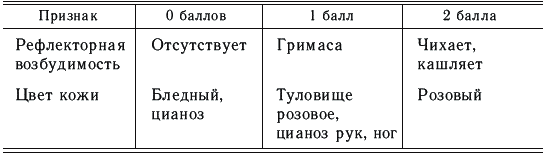 Здоровый новорожденный ребенок через 1 и 5 минут должен иметь 8–9 баллов. Снижение суммы баллов может быть обусловлено незрелостью ребенка, травмой во время родов, гипоксией, внутриутробной инфекцией и другими неблагоприятными факторами.